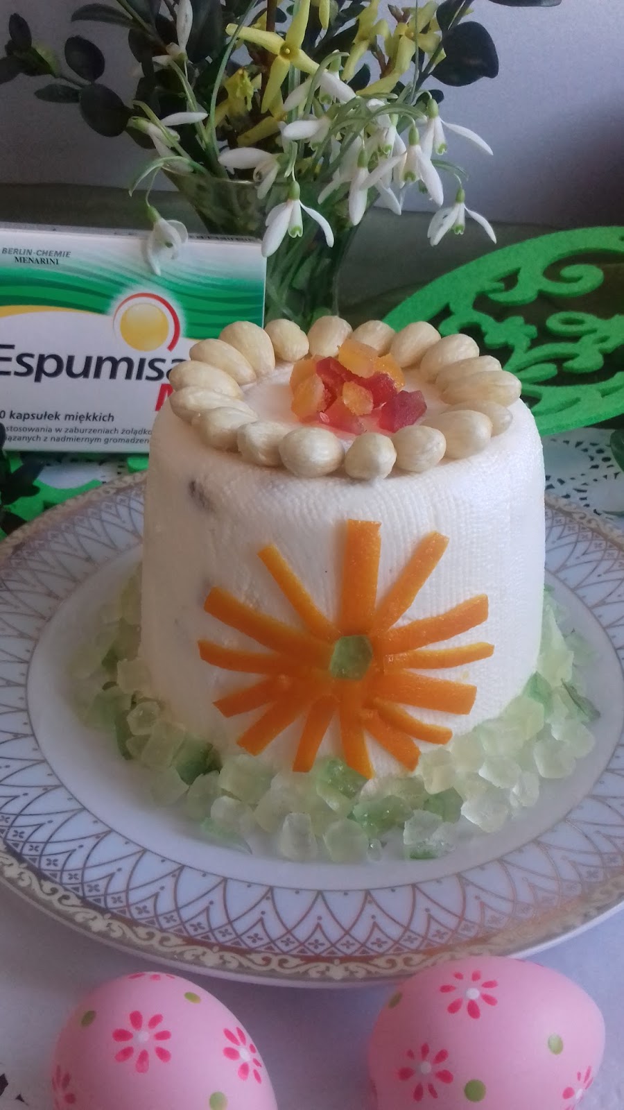 na talerz i udekorować kandyzowanymi owocami, migdałami. Kwiat zrobiłam z